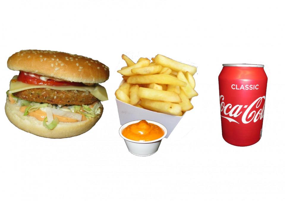 Double galette associant les légumes (petits pois, carottes, oignons, salsifis, avec un mélange de céréales (blé, avoine, orge, seigle), avec une sauce sucré aux oignons, de la salade, des oignons frits, des Cornichons et double tranche de fromage. Un burger au goût unique l'essayer c'est l'adopter ! Servi avec frites +/-280g, une boisson au choix et une sauce au choix.